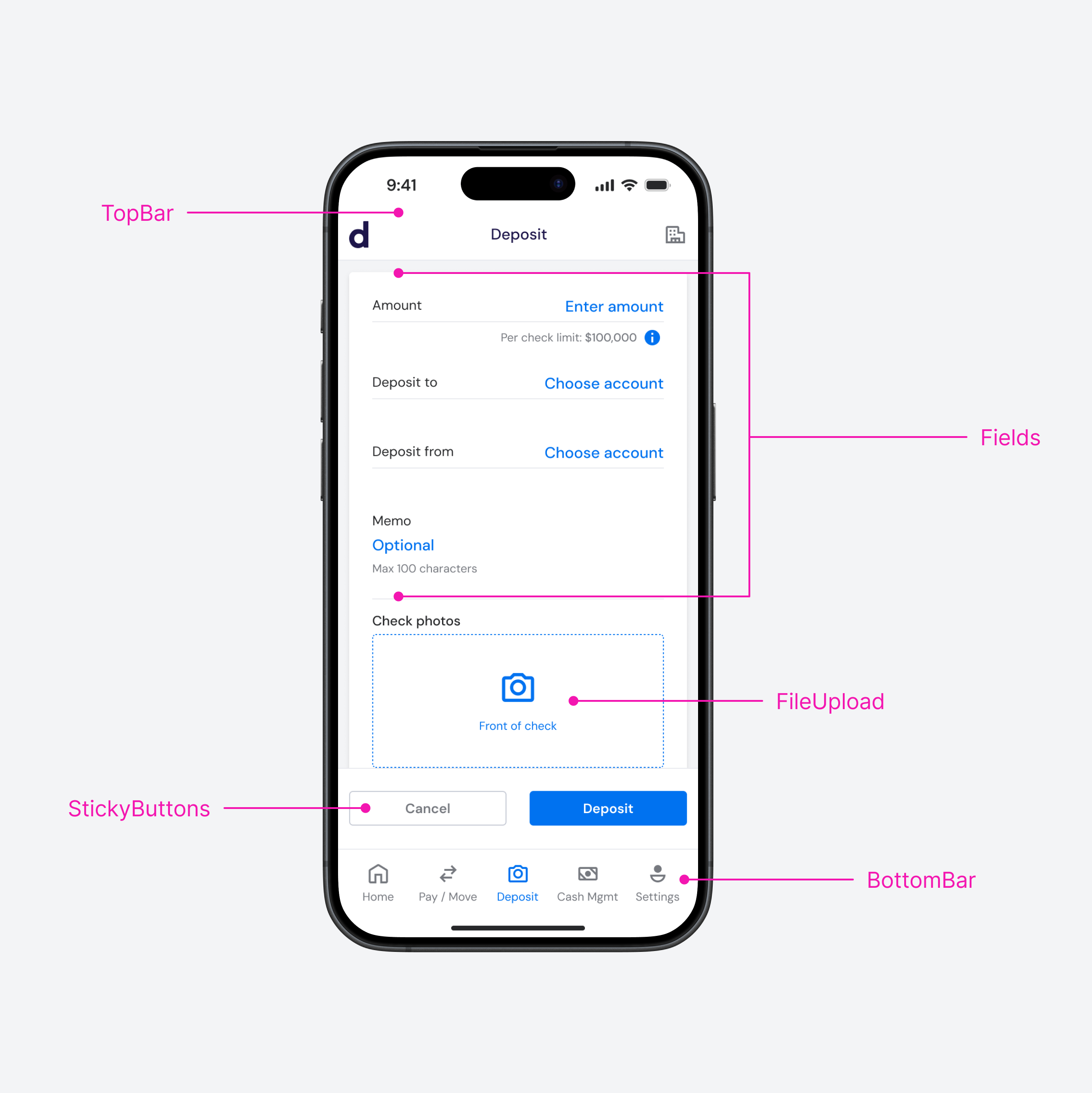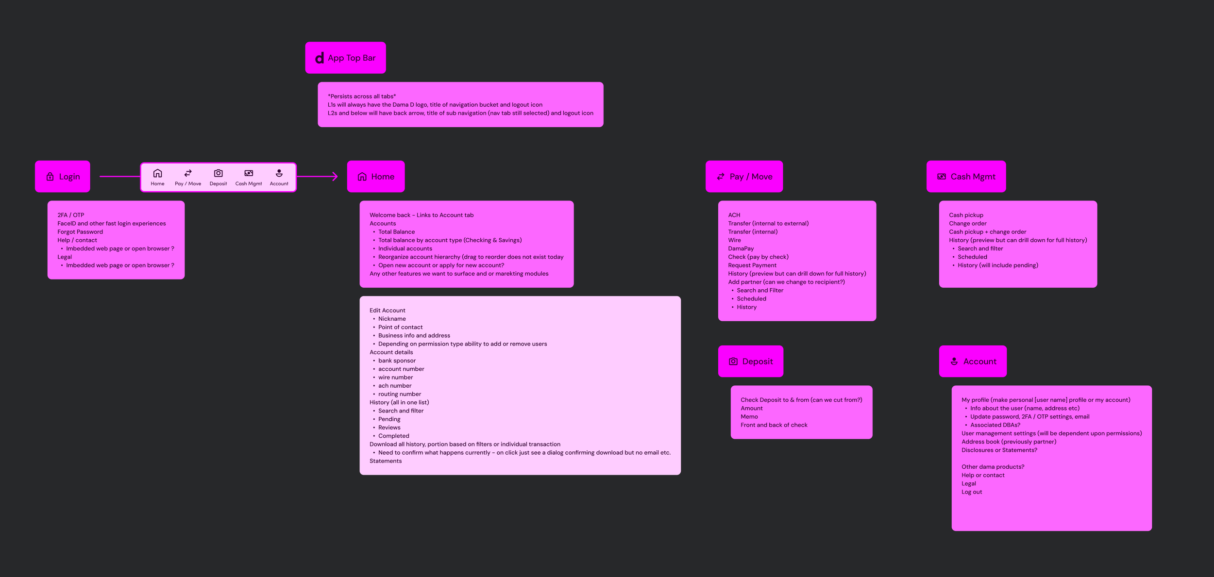 We rebuilt the IA from scratch around five primary surfaces: Home, Pay/Move, Deposit, Cash Management, and Account. Each one had a clear job, and every flow inside the app could be traced back to one of them. The new structure also gave us a place to land features that had been homeless in the old app — things like multi-company switching and pending approvals — without forcing them into navigation slots they didn't belong in.