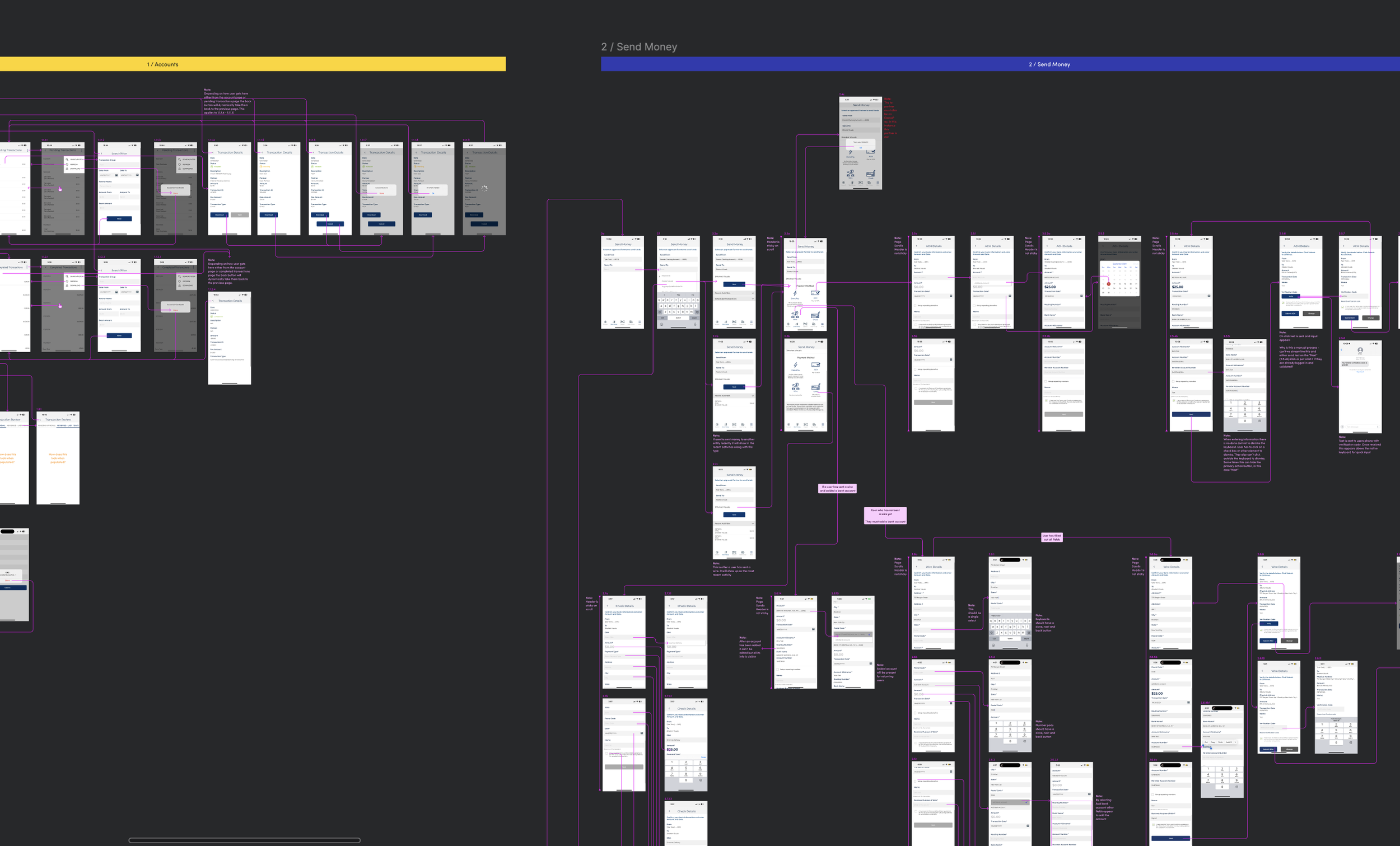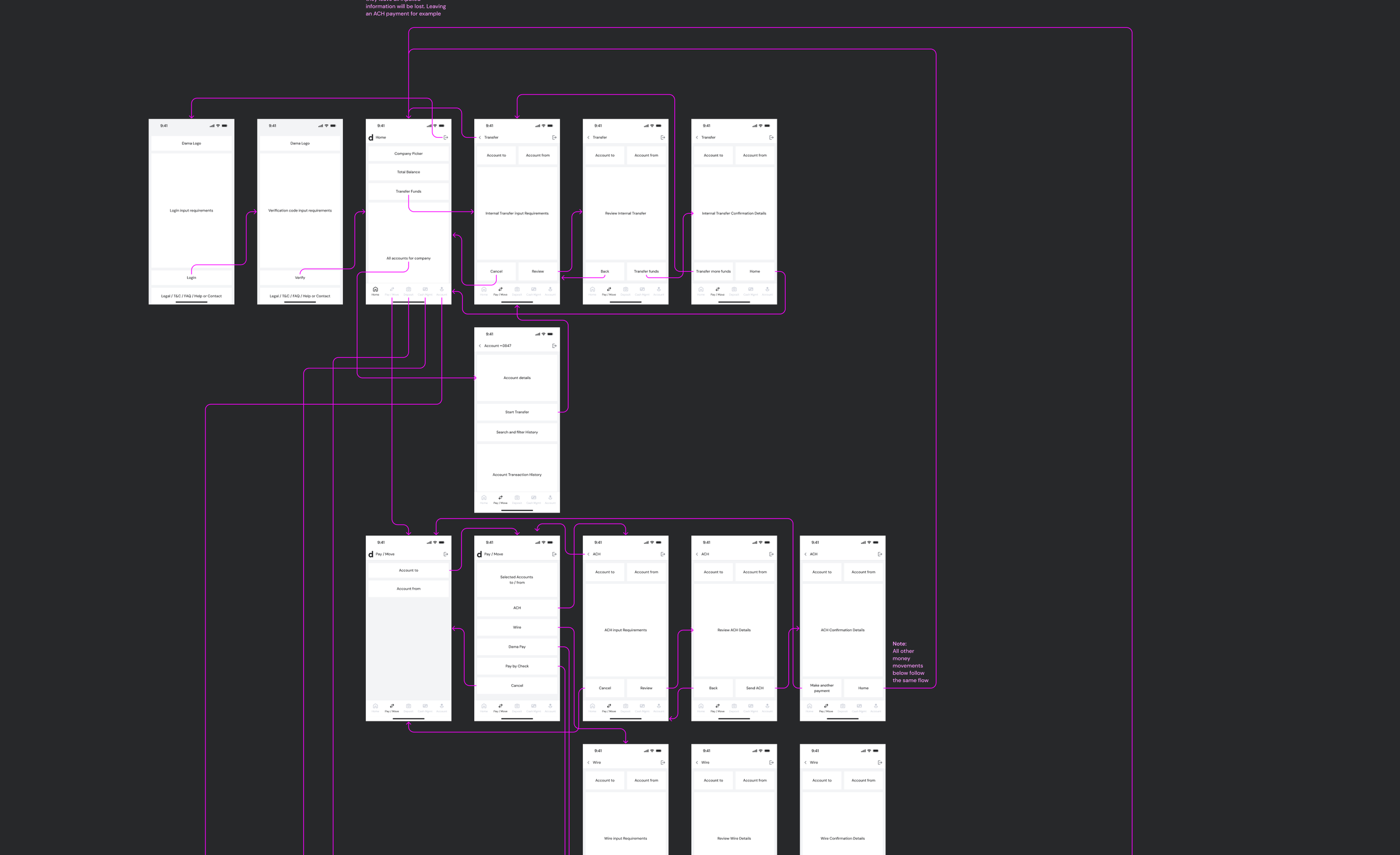 From there we built out wireframes for the new flows, anchored on what the discovery research had told us mattered most: getting deposits to work, navigating between companies, and moving money confidently.