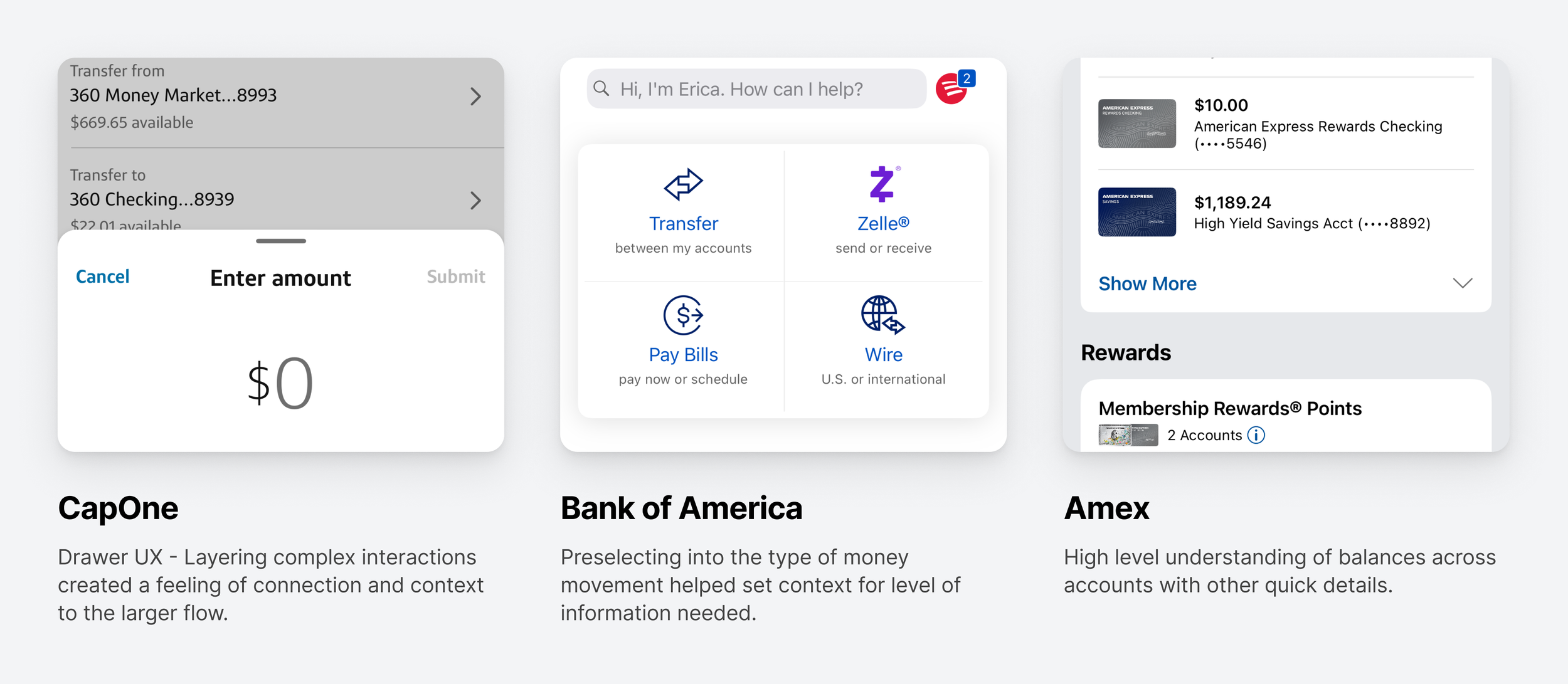 In parallel, we looked at how mainstream banking apps handled the patterns we needed to solve. Capital One's drawer UX showed how to layer complex interactions inside a single flow without losing context. Bank of America's home screen pre-selected money movement type before showing detail, which set a clearer mental model for users. Amex's account view gave a high-level read on balances across accounts at a glance — exactly the kind of multi-entity visibility our customers had asked for.