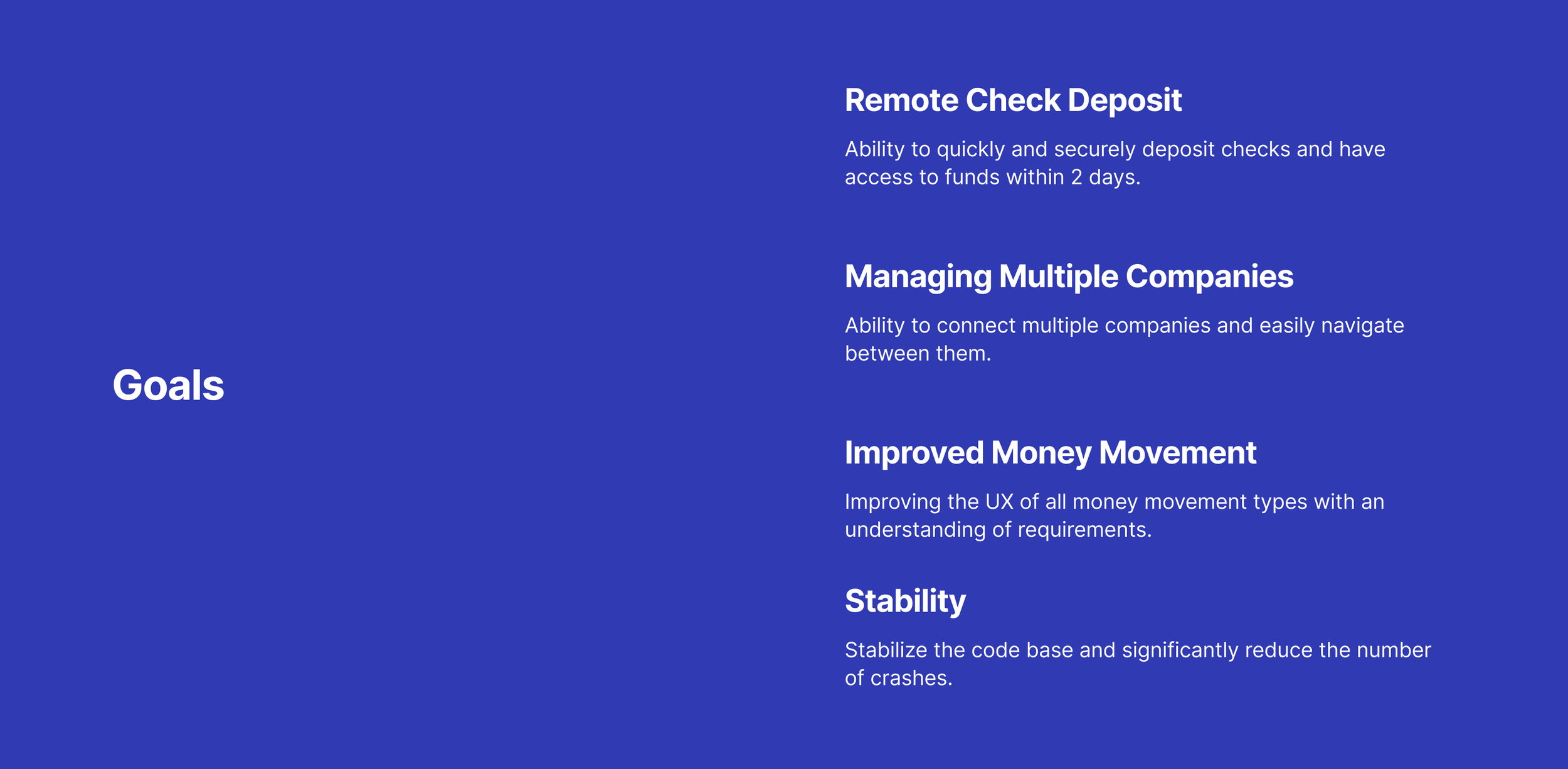 With discovery wrapped, we landed on four goals that would shape the rebuild: getting Remote Check Deposit to work reliably with funds available within two days, letting operators manage multiple companies from a single login, improving the UX of every money-movement flow, and stabilizing the codebase to drive crashes down.