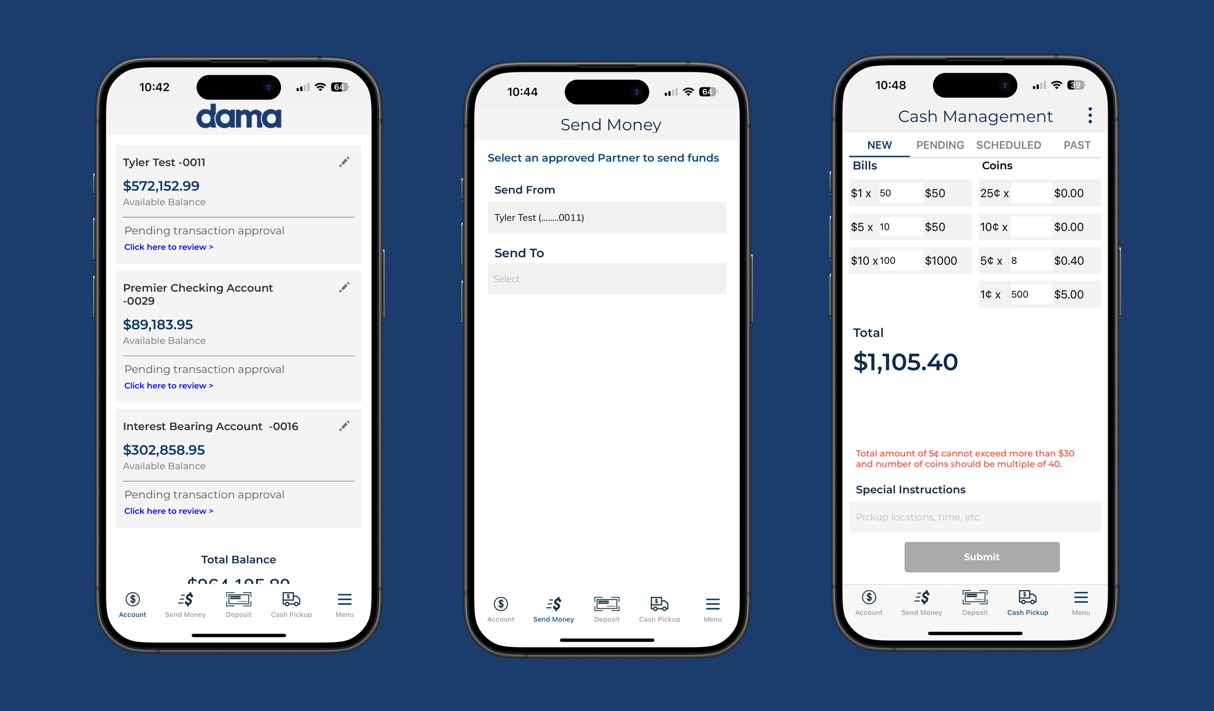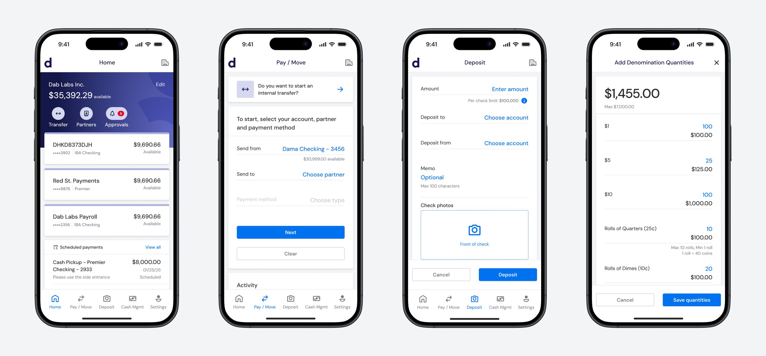 The Home screen anchors a multi-account view with quick access to transfers, partners, and pending approvals. Pay/Move walks operators through a single guided flow regardless of payment method — ACH, wire, internal transfer, partner payment. Deposit handles remote check capture with clear per-check limits surfaced before the user gets to the camera. Cash Management gives operators direct control over scheduled cash pickups and change orders, which had been buried in the legacy app.